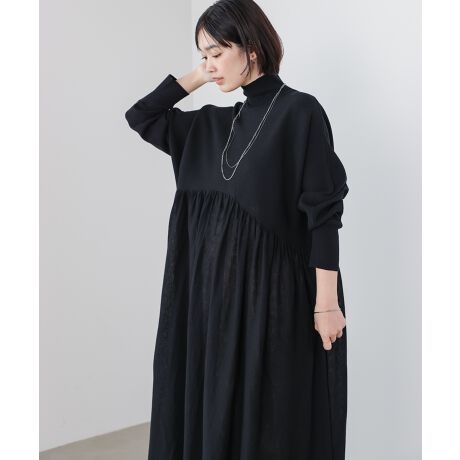 高めの切り替え位置から広がるギャザーデザインが、体のラインを拾わずふんわりとした女性らしいシルエットを演出します。シンプルなハイネックデザインが顔まわりをすっきりと見せ、大人の落ち着いた印象に仕上げてくれます。一枚でコーディネートが完成する高見えワンピースです。