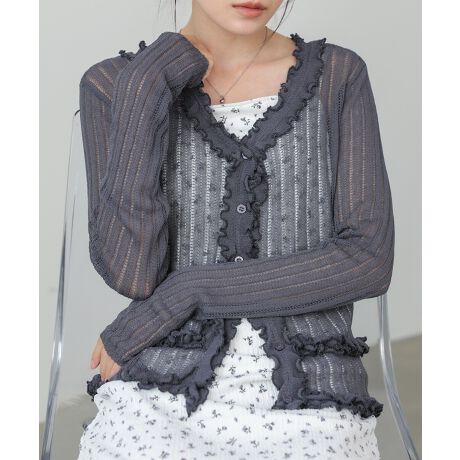 繊細な透かし編みと立体的なフリルが目を惹く、フェミニンムード漂うVネックニットカーディガン。縦ラインを強調するリブ調の編地で、すっきりとしたシルエットに仕上げました。フロントから裾、袖口まであしらわれたフリルが華やかさをプラスし、シンプルなインナー合わせでも着映えする1枚。ボタンを閉じてトップス風にも、羽織りとしても活躍するアイテムです。
