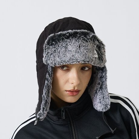 ツバ付きのフライトキャップスタイルで、耳当て部分にボリュームのあるフェイクファーを採用。