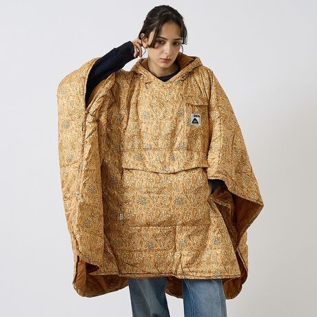 アウトドアシーンなどで、少し肌寒い時に重宝する中綿入りのポンチョ。