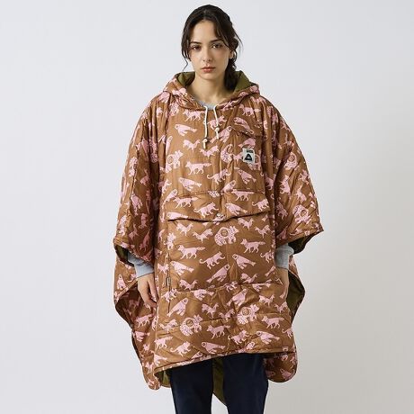 アウトドアシーンなどで、少し肌寒い時に重宝する中綿入りのポンチョ。