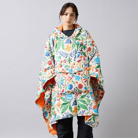 アウトドアシーンなどで、少し肌寒い時に重宝する中綿入りのポンチョ。
