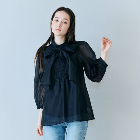 ・シアー感がある素材にAudie a Muses人気のフラワーモチーフを施した華やかなブラウス。
