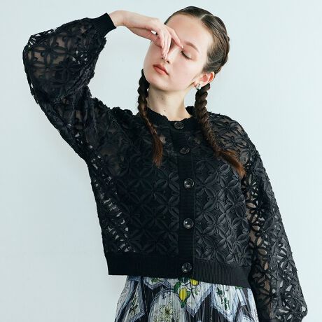 ・チュールの上にフラワーモチーフのテープ刺繍を施した立体感のあるリッチな素材にニットをドッキングしたカーディガン。