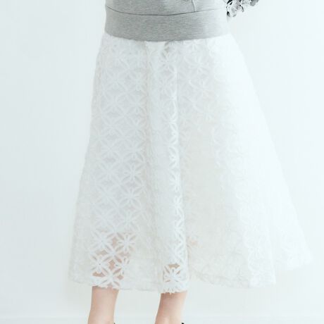 ・チュールの上にフラワーモチーフのテープ刺繍を施した立体感のあるリッチなスカート。