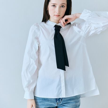 ・袖にフリルがプラスされ、女性らしさあふれる本体に取り外しのネクタイがついたデザインシャツ。