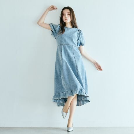 ・きれいめな表面感と適度な落ち感を兼ね備えた、デニム素材のワンピース。