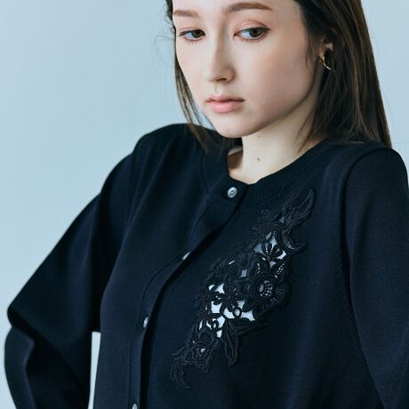 ・シンプルな本体に、レースがドッキングされたデザインカーディガン。