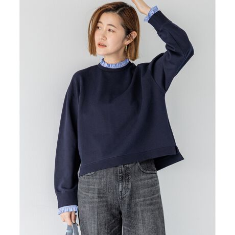 ストライプ柄のフリル襟とカフスが、スウェットから覗くシャツをレイヤードしたようなデザインのトップスです。カジュアルなスウェットに上品なフリルが加わることで、一枚で洗練されたスタイルが完成します。襟とカフスは取り外しが可能で、外せばクロップド丈のクルーネックスウェットとしても活躍。気分やシーンに合わせて2WAYの着こなしをお楽しみいただけます。スカートやワイドパンツともバランスが取りやすく、幅広いコーディネートにマッチします。デイリー使いはもちろん、きれいめなボトムスと合わせれば、ちょっとしたお出かけにもぴったりの上品カジュアルスタイルが叶います。 カラーは、深みのある上品なネイビー(#075)、明るく柔らかな印象のライトグレー(#003)、落ち着いたベーシックなグレー(#004)の3色展開です。