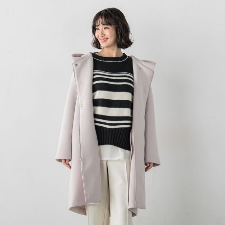 軽く柔らかな着心地ながら、フードを立体的に仕上げることでショールカラー風の上品な表情に。