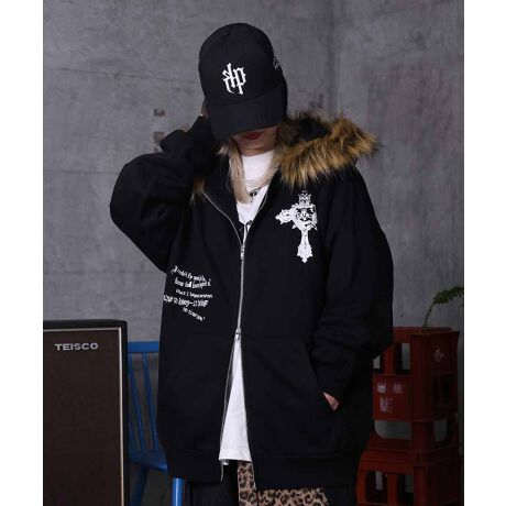 ILL'S【MAROCORE / マロコア】クロスモチーフ 裏起毛 ファー プリント ジップパーカー
