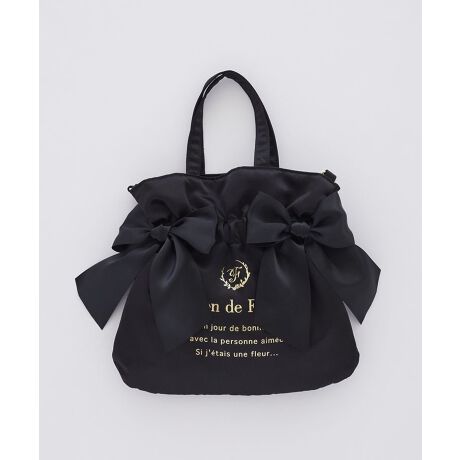 上品なサテン生地にブランドロゴの箔プリントとダブルリボンでフェミニンに仕上げたトートバッグ。