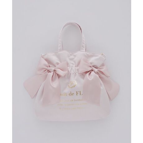 上品なサテン生地にブランドロゴの箔プリントとダブルリボンでフェミニンに仕上げたトートバッグ。