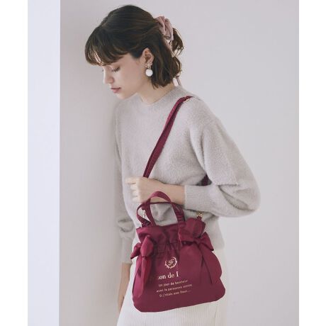 上品なサテン生地にブランドロゴの箔プリントとダブルリボンでフェミニンに仕上げたトートバッグ。