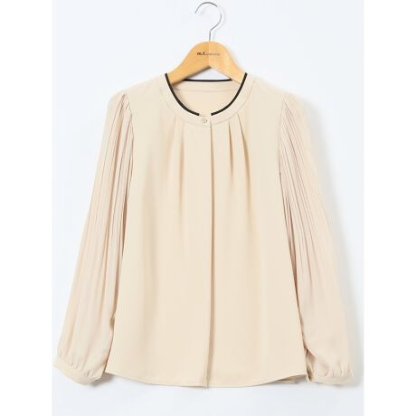 お顔まわりを華やかに演出してくれる、長袖のプルオーバーブラウスです。衿部分の配色とスリット、ふんわりとしたプリーツ袖、袖口と衿元の金ボタンがポイント。キチンと感のあるクリーンなルックスなのでオンオフ兼用で大活躍してくれます。