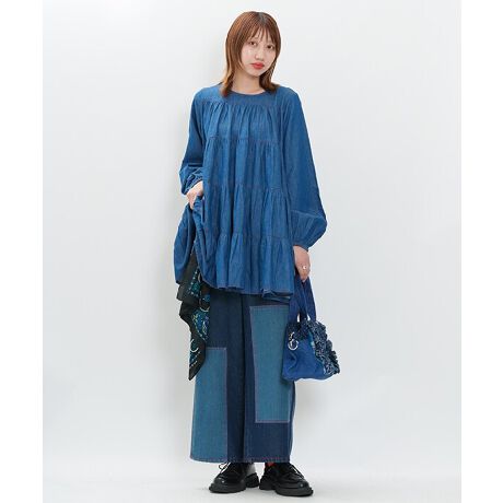 たっぷり寄せたギャザーが動くたびにふわっと広がり、デニム素材ながらも華やかでゴージャスな印象に◎