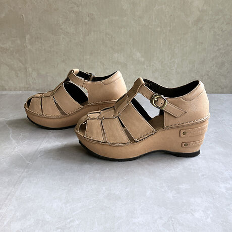 弾力性、屈強性共に厚底のウェッジソールはワイズはゆったりとした3E仕様で、足幅が気になる方にもやさしい履き心地です。