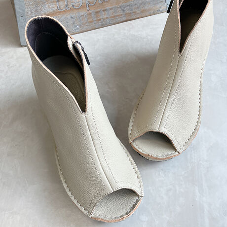 アッパーからアウトソール側面まで、贅沢に同素材の本革を使用した存在感のあるオープントゥブーティ。