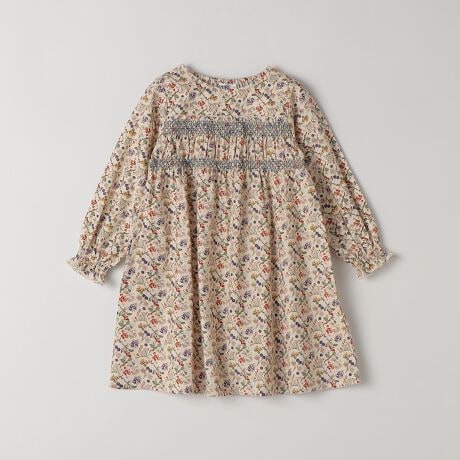 小花柄プリントとスモッキングデザインが、華やかで可愛らしい印象のワンピース。