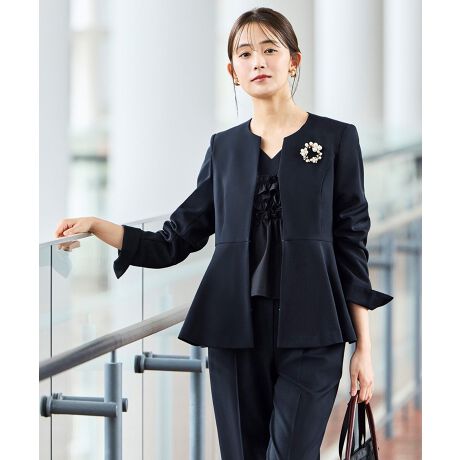ペプラム切替が映えるノーカラージャケット。デコルテを綺麗に見せてくれるキーネックデザイン。
