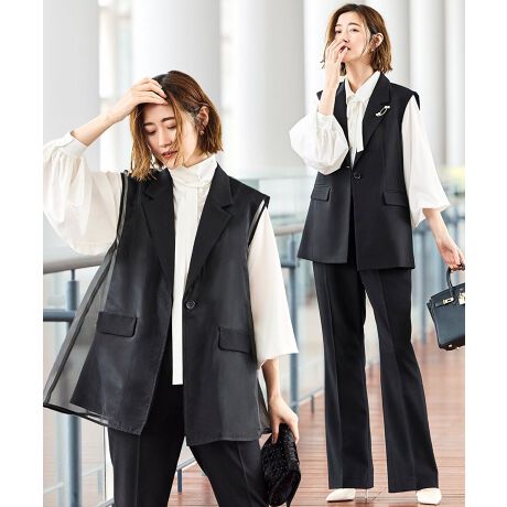 テーラードジレのマニッシュなシルエットに、軽やかなオーガンジージレを重ねたレイヤードデザイン。