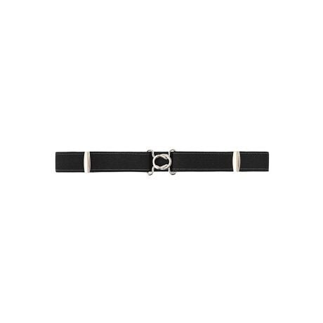 プリーツスカートのプリーツをきれいに折る為の必須アイテム。シンプルなブラック地にステッチ調のスカートベルトです。スカートの長さ・サイズ調節に役立ち、手持ちのスカートに装着すれば手軽に短め丈にアレンジできます。伸びる素材なので、着け心地もらくらくです。