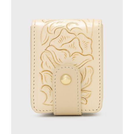 クリスマスコレクションの新型のお財布。フラップのフチをカービングの柄に合わせてカットしたデザイン。