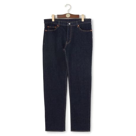濃色で上品な見た目のストレッチデニム■素材12.5oz(オンス)のストレッチデニムを使用。デニムらしいしっかりとした厚みがありながら、伸縮性を備えることで動きやすさと快適な穿き心地を両立しています。表面には程よいムラ感を持たせ、濃色ながら表情のある仕上がりに。カジュアルになりすぎず、きれいめなスタイルにも取り入れやすい素材感です。