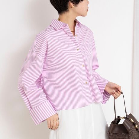 ・袖口は幅広カフスで、折り返すとシェルボタンに切り替わりさりげない表情変化を楽しめる一枚
