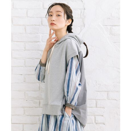 カットソーに布帛素材を組み合わせた、立体感のあるコンビデザイン。