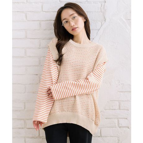 メッシュ編みのニットベストと、ボーダーカットソーを組み合わせたセットアイテム。