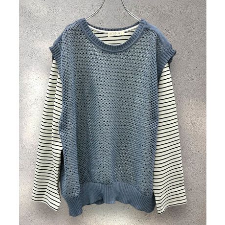 メッシュ編みのニットベストと、ボーダーカットソーを組み合わせたセットアイテム。