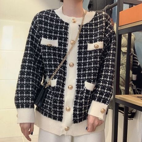 -ゴールドボタンが上品なアクセントの大人カーデ