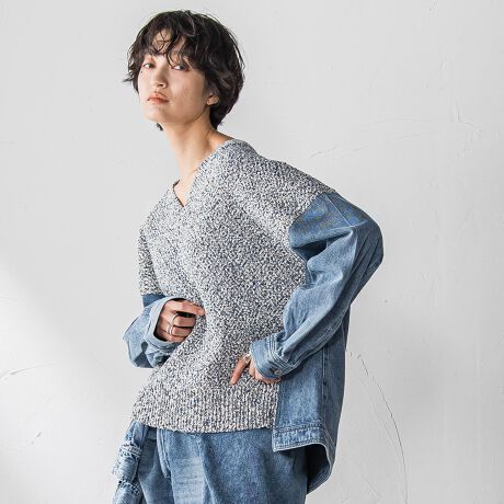 表情のあるデニムライクなニットと、加工デニムを組み合わせた、デニム好きにはたまらないドッキングプルオーバー。