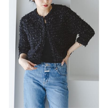 異素材の糸を組み合わせて編み上げた、サマーツィード風のコンパクトなニットジャケット。