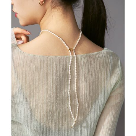 クリップを首近くで留めてチョーカー風に、ロングネックレスとして装着したりと雰囲気を変えて楽しめるパールラリエット。