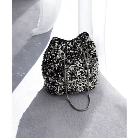 スパンコールが縫い付けられた巾着型のハンドバッグ。