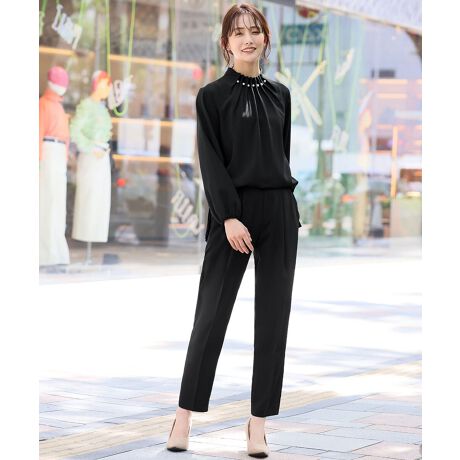 襟元のディテールコンシャスなパールデザインが印象的なブラウスと定番人気のテーパードパンツをセットにした2点セットアップパンツドレスです。