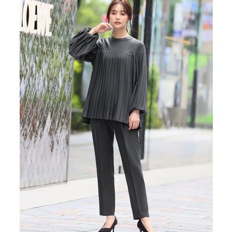 洗練された大人の女性に贈る表情豊かなプリーツブラウスとテーパードパンツの2点セットアップパンツドレス。