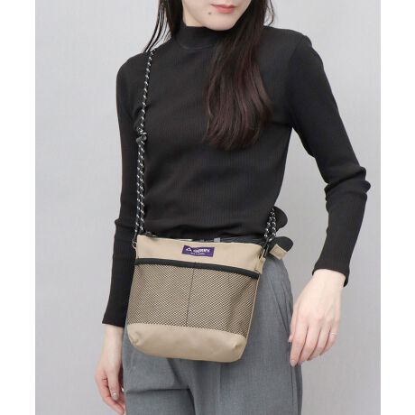 メッシュ素材の外ポケットに、ザイルコードのショルダーベルトやカラビナなど、アウトドアな雰囲気が特徴のミニショルダーバッグ。タウンユースでもアウトドアでも使いやすい、デザイン性と機能性を兼ね備えたアイテム。