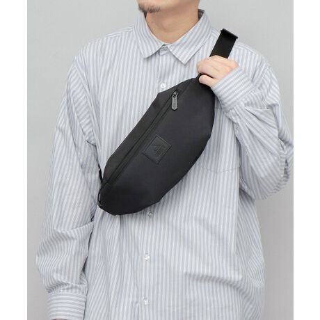 タウンユースからアクティブシーンまで使いやすい、ウエストバッグ。フロントに配置された、ブラックタグがワンポイントに。