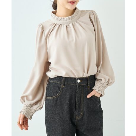顔まわりを華やかに見せるフリルハイネックは、ふんわりとしたパフスリーブが上品な印象を演出します。