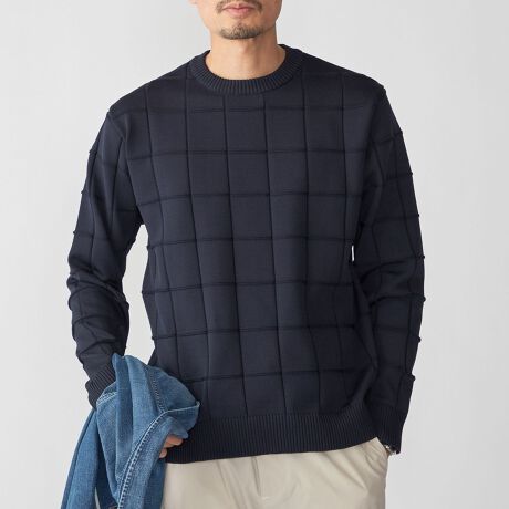立体的な編みでのチェック柄が目を惹く1枚で、アウターのインナーでも1枚着でも活躍するアイテム。
