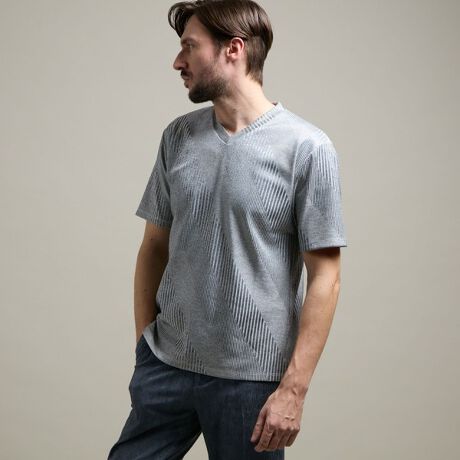 様々なスタイルに合せやすい浅めのVネックとサイドスリットがポイントのシンプルな半袖カットソーです。
