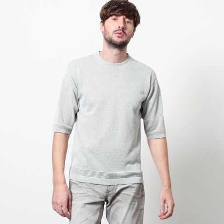 レーヨンポリエステル糸を使用して、12Gのハイゲージで編み立てた半袖天竺編みニットになります。