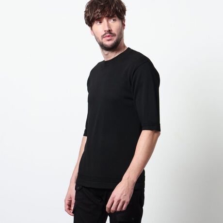レーヨンポリエステル糸を使用して、12Gのハイゲージで編み立てた半袖天竺編みニットになります。