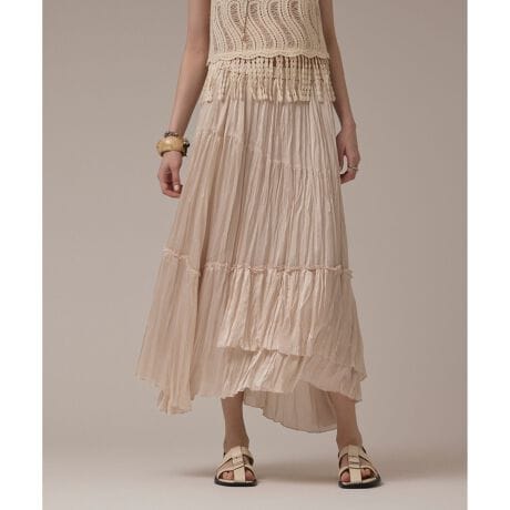 用尺をたっぷりとった贅沢なボリューム感や、バイアスのアシメトリーティアードで表現した優美なデザインが歩いた時の美しい動きを生み出し、スタイリングに映える特別な雰囲気を纏います。シンプルなTシャツを合わせるだけで、上質な素材の風合いや凝ったディテールがカジュアル見えせず、どこか華やぎのある印象に。優しい雰囲気を纏えるニュアンスベージュと上品な大人の装いに似合うダークブラウンの2色をご用意しました。