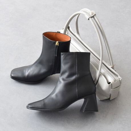 フレアヒールが特徴的なセンターシームショートブーツは、綺麗なシルエットでスタイリッシュな雰囲気です。