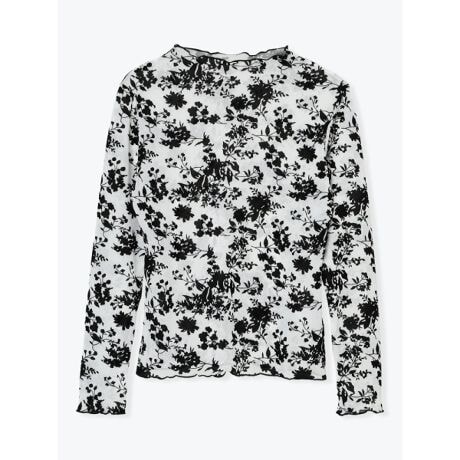[型番:25560772336]透け感のあるチュール素材に、フロッキーフラワーをあしらった表情豊かなプルオーバー。軽やかな着心地で、インナー使いでも一枚でもスタイリングのアクセントに。ニットやワンピースのレイヤードにも映える、シーズンムード高まるアイテムです。