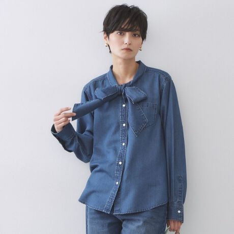 ・ボウタイデザインが華やかなデニムブラウスです。